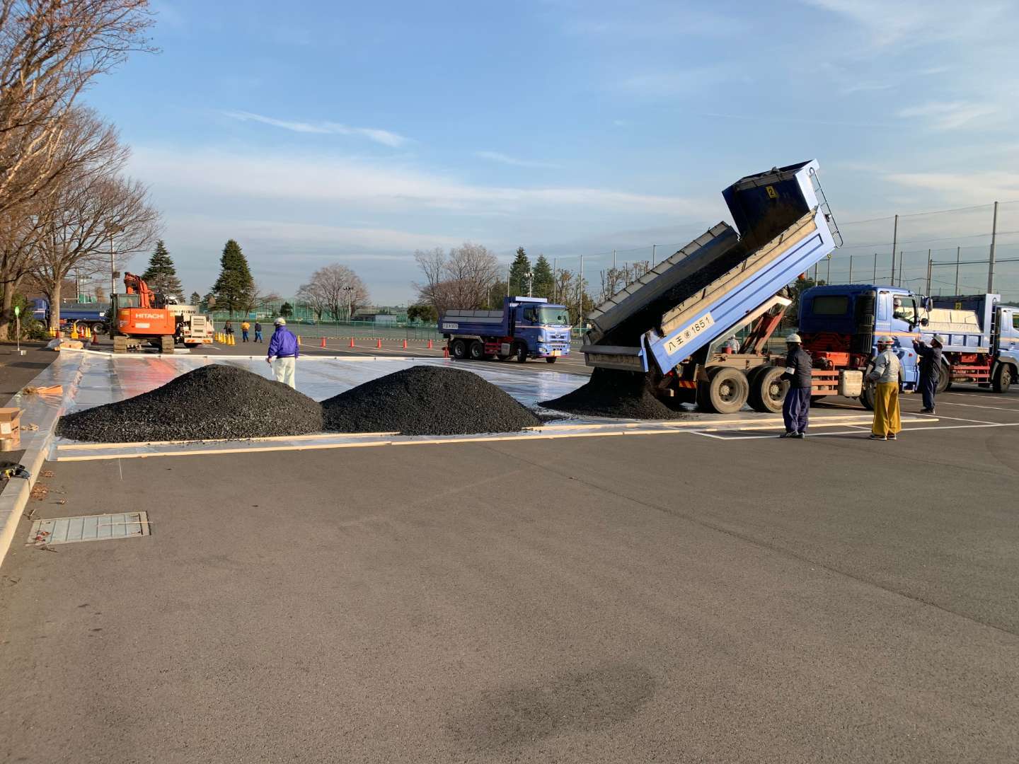 アスファルトの上にバージン砕石を敷込、