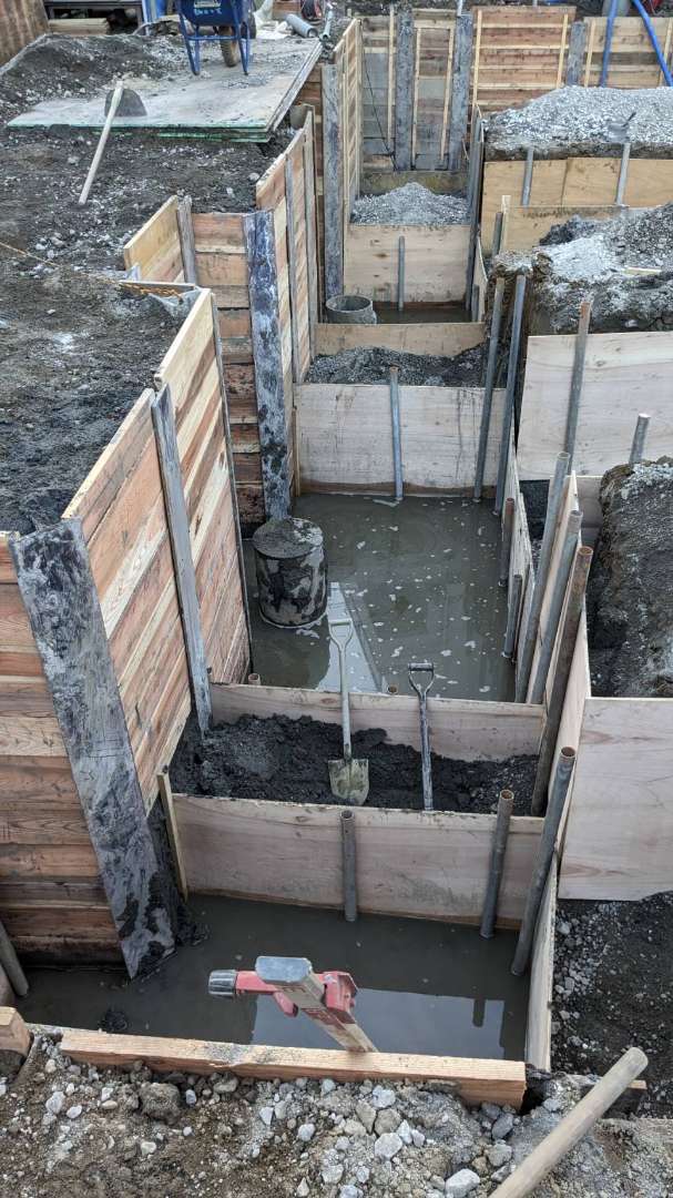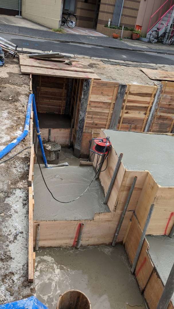 前面道路が狭く、深い根切で、おまけに水位が高く、掘削をすると湧くように水が出る敷地での土工事です。
