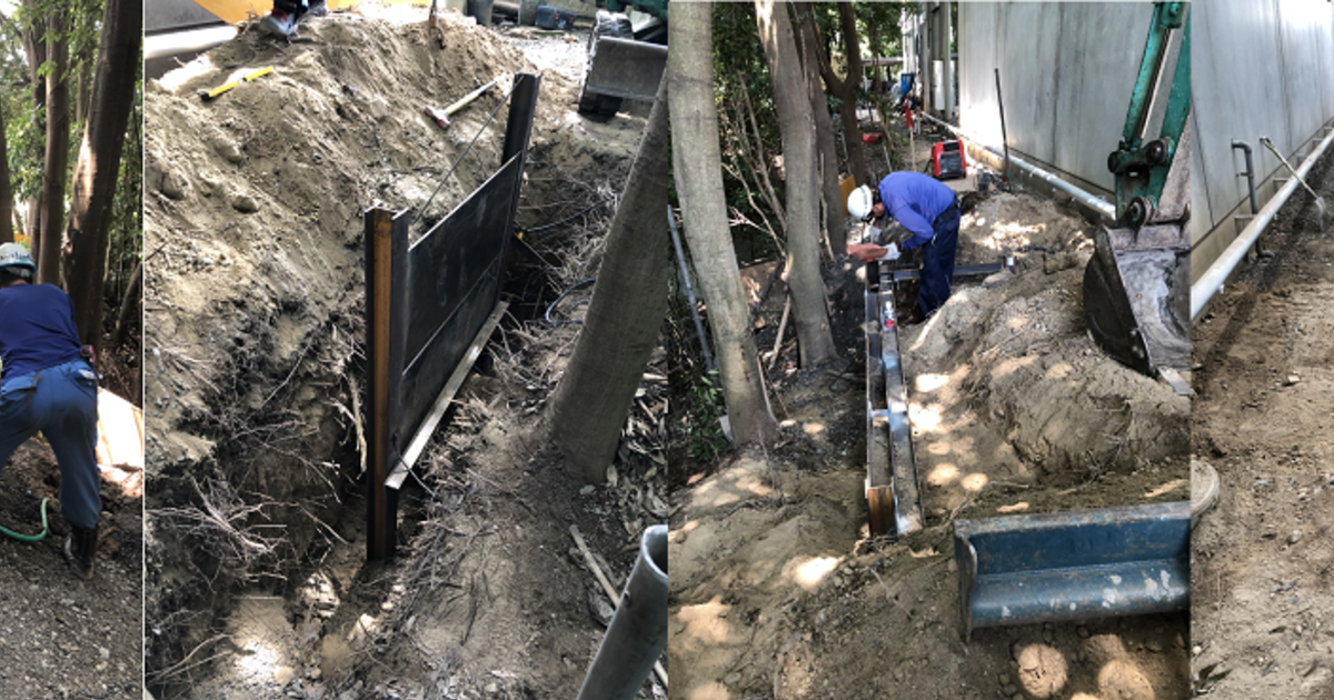 バックホーで一カ所づつ、掘削してコンクリートで根巻しながらH鋼の埋設を行いました・・。